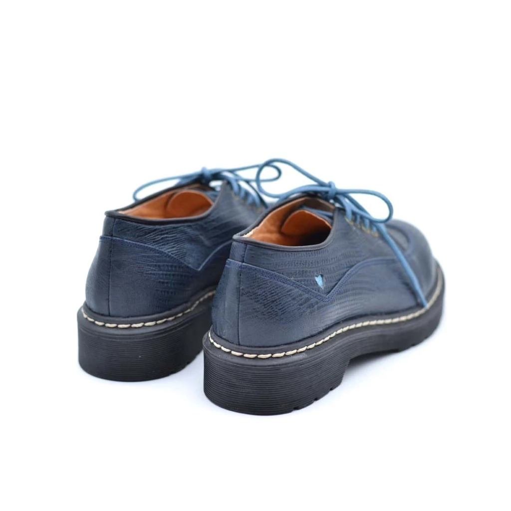 Fabricados en cuero color azul, (textura lagarto, es una textura irregular con un poco de lustre).