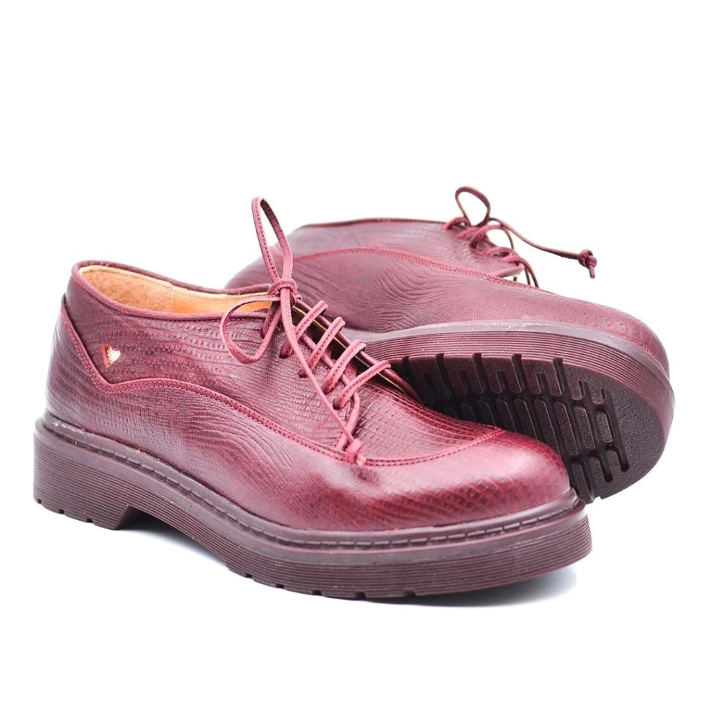 Corazòn calado, bajo fondo cuero cobre rosa, cordones 100% cuero en color bordo.