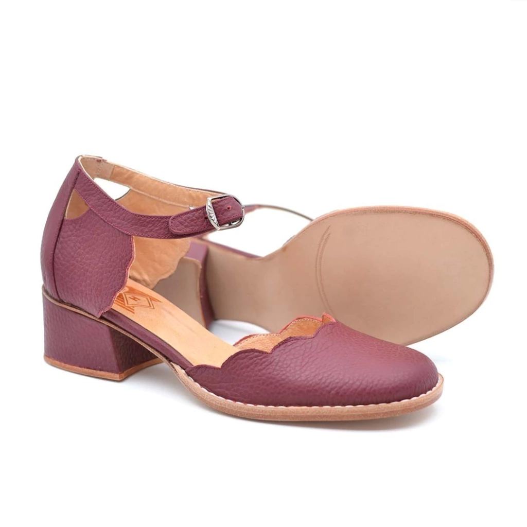 La suela es de cuero, con un taco cuadrado de 3 cm de altura, forrado en cuero.